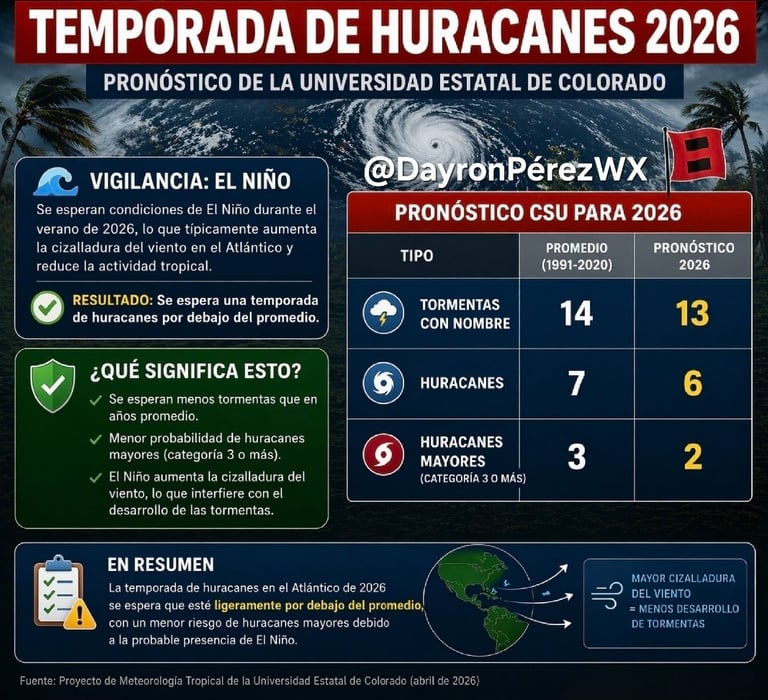 El pronóstico inicial de la Colorado State University (CSU) para la temporada de huracanes del Atlántico 2026 apunta a una actividad ligeramente por debajo del promedio, con un estimado de 13 tormentas con nombre, 6 huracanes y 2 huracanes mayores, cifras inferiores a la climatología 1991–2020. En términos de energía ciclónica acumulada (ACE), se proyecta una temporada cercana al 75% de lo normal, con valores estimados de 90 unidades de ACE total y 50 unidades al oeste de los 60°W, lo que sugiere menor actividad en zonas más cercanas a tierra.
